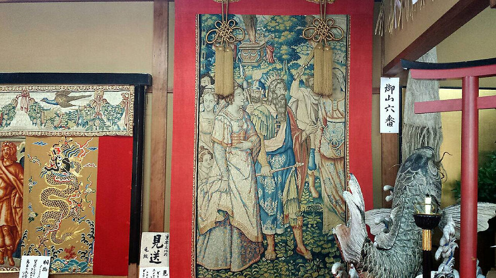 The god image of Koi(carp) looks like trying to jump. The ornament is the tapestry or the 16th century depicting characters and scenes from Greek epics “Illiad” composed by Homer.